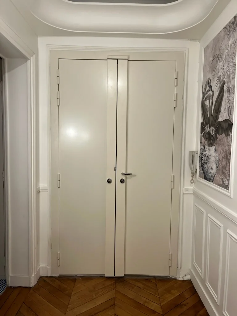 Des cadres moulurés sur mesure en bois fabriqués par nos soins, donnent un style Parisien a cette porte blindée !